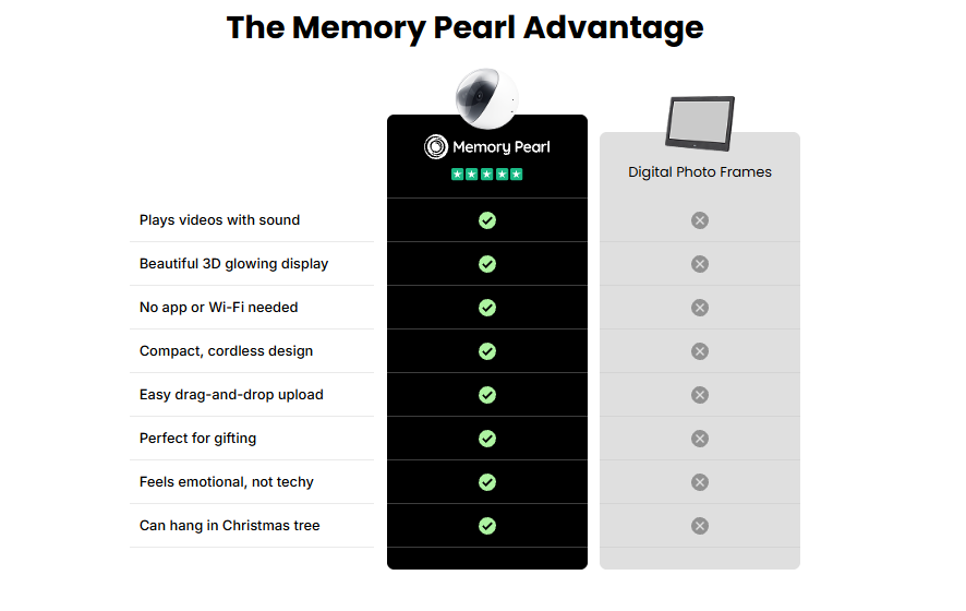 Unlike paper cards or phone albums that get lost, the Memory Pearl safely stores your moments in a compact, durable ornament that can be used year after year.